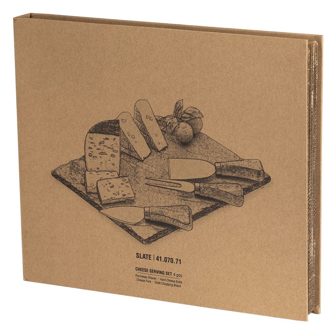 SLATE set se sastoji od kamene ploče dimenzija 33.3 x 28.8 x 2.8 cm i tri pribora za sir sa drvenim drškama. Kombinacija kamena i drveta ne samo da pruža vizuelnu privlačnost, već i garantuje dugotrajnost i otpornost na habanje.